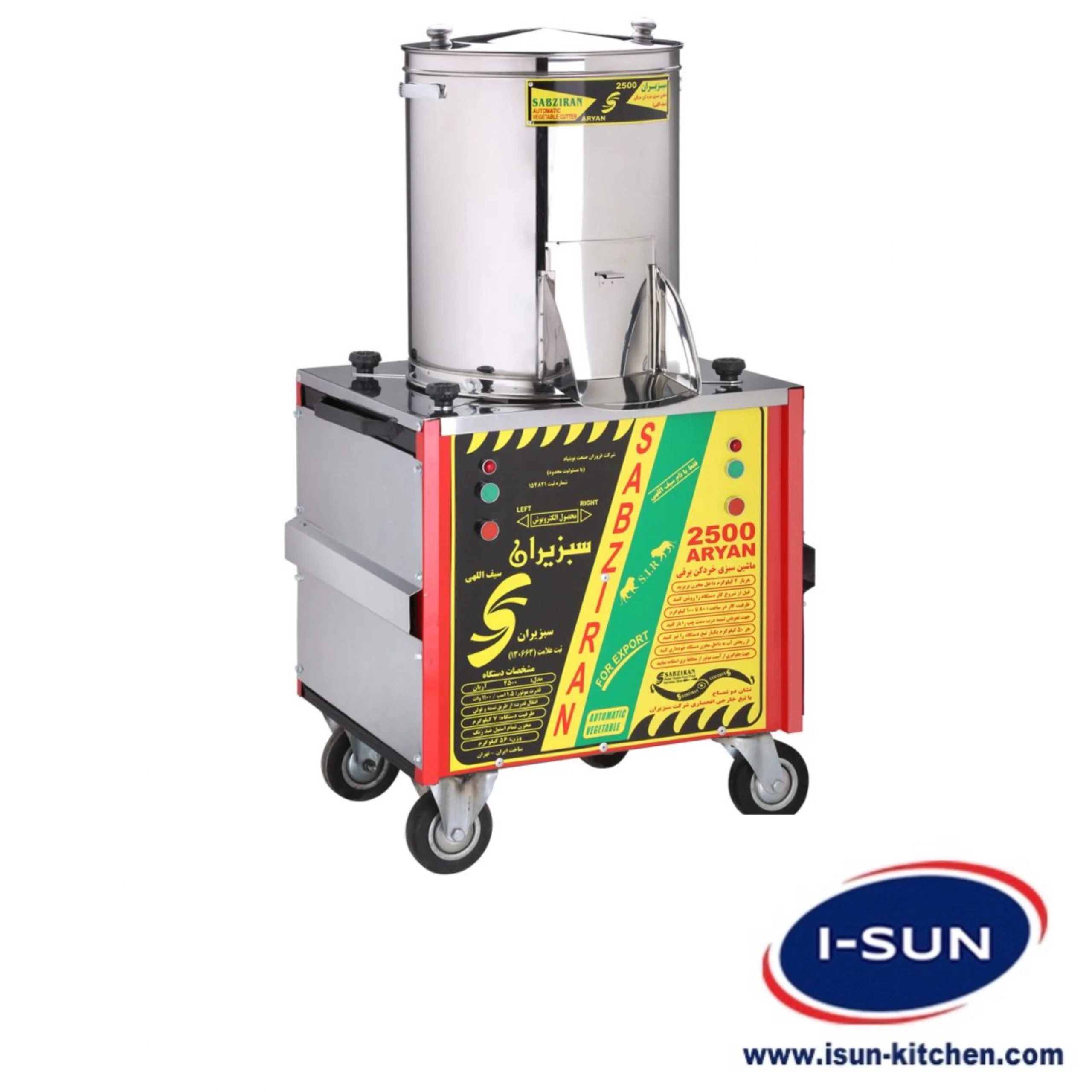 سبزی خرد کن سبزیران مدل 2500 آریان یک دستگاه ایرانی و کارآمد است که توسط گروه سیف الهی طراحی و ساخته شده است. این دستگاه قدرتمند میتواند حجم زیادی سبزی را خرد و ریز کند. این دستگاه برای خرد کردن سبزی و موادی مانند کلم، فلفل، سیبزمینی، هویج، جوانه گندم، کرفس، نخود خیس شده، مغز گردو و مغز بادام و پسته و نخودچی طراحیشده و موادی که آبدار هستند یا باعث ورود آب یا آب سبزی و صیفی وارد دستگاه و موتور شود نباید وارد دستگاه شوند. مناسب برای هتل ها و غذاخوری ها و مطبخ ها و آشپزخانه های صنعتی می باشد.