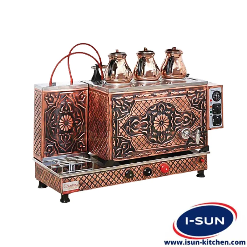 سماور مسی مراکشی این امکان را به شما میدهد تا همزمان دو طعم چای برای ذائقه های مختلف تهیه کنید یا چای را همزمان با دمنوش عمل آوری کنید و از هیتر بغل آن برای کارهای گوناگون مانند تهیه قهوه ترک میتوانید استفاده نمایید.چای ساز یا همان سماور مراکشی ، مناسب استفاده در هتل ها، کافه ها، کافی شاپ ها، رستوران های سنتی، اداره جات، دفاتر کار و… این سماور با طراحی بسیار زیباو متفاوت داراری مخزن 40 لیتری و قابل اتصال به آب شهری در دو نوع برقی وگازی می باشد.این محصول تماما از جنس مس بوده وتولید کشور ترکیه می باشد