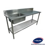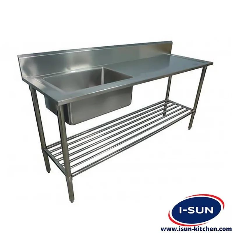 با توجه به اینکه آشپزخانه های صنعتی می بایست مکانی کاملا بهداشتی باشد و بر اساس قوانین بهداشتی می بایست دستگاه ها کاملا از استیل ساخته شود سینک صنعتی تک لگن با استفاده از استیل نگیر 304 ضد زنگ ساخته می شود. سینک صنعتی تک لگن بیشتر مناسب استفاده برای قسمت آماده سازی در آشپزخانه های صنعتی می باشد چرا که این سینک دارای یک تکه سینی کنار لگن سینک می باشد و سینی قرار گرفته محل مناسبی برای قرار دادن انواع میوه، مرغ، ماهی، گوشت و… می باشد. پیشنهاد می شود در این مدل سینک نیز مشتریان محترم از لگن پرسی که کیفیت بسیار بالاتری نسبت به لگن جوشی دارند استفاده نمایند تا علاوه بر مباحث بهداشتی خیالشان از بابت استقامت و کارایی مناسب سینک در مدت زمان طولانی راحت گردد. معیار ضخامت لگن در سینک به این صورت می باشد که اگر وسیله ای مانند چاقو از فاصله معین رها شود استقامت و ضخامت ورق به قدری باشد که به لگن سینک آسیبی وارد نشود. و البته رویه ی سینک می تواند به صورت یک تکه نیز پرسی باشد یعنی علاوه بر پرسی بودن خود لگن رویه نیز پرسی باشد و تمام رویه یک تکه باشد. ابعاد این سینک نیز مانند سینک دو لگن دارای طول های 120 – 150 و 190 سانتی متر دارای عرض 65 سانتی متر و ارتفاع 90 سانتی متر می باشد اما قابلیت سفارشی را دارا می باشد. ابعاد لگن در این مدل سینک به طول 60 سانتی متر و عرض 60 سانتی متر می باشد. معمولا سینک های کوچکتر برای مکان هایی که محدودیت جا دارند استفاده می گردد. ابعاد و ضخامت پروفیل های استفاده شده در پاتراکی هم مثل سینک های دو لگن 4*4 سانتی متر و 2*2 سانتی متر می باشد. بدیهی است طول سینی کنار سینک با توجه به ابعاد کلی سینک با کم کردن طول کل از طول لگن سینک حاصل می شود. در این مدل اگر مشتری بخواهد طول سینی بیشتر شود می بایست سینک های جوشی را سفارش دهد چون ابعاد لگن های پرسی استاندارد می باشد.
