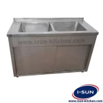 در بعضی از آشپزخانه های صنعتی با توجه به کمبود فضا می توان با بستن پایین سینک و ایجاد یک مدل کابینت در قسمت پایین آن یک فضای اضافه ایجاد کرد و از آن برای بعضی کارها استفاده کرد. که به این مدل سینک، سینک کابینت دار یا سینک زیرکابینتی گفته می شود. همچنین ممکن است در بعضی از آشپزخانه های صنعتی نیاز به پوشاندن قسمتی از کار جهت نظم و عدم شلوغی ظاهری محیط باشد تا بعضی از متریال مصرفی مانند شوینده ها و… در آنجا گذاشته شود. یکی از تفاوت های عمده ی سینک های دارای کابینت با سینک های معمولی در این است که معمولا به صورت کف بسته ساخته می شود یعنی به جای وجود پاتراکی در قسمت کف آن از ورق کامل استفاده می شود و کف به صورت کامل پوشیده می شود. در این مدل سینک درب ها می تواند به صورت بازشو یا به صورت کشویی باشد که معمولا به صورت درب کشویی سفارش داده می شود. با توجه به اینکه سینک به صورت دائم با آب سر و کار دارد حتما می بایست تمام قطعات آن از استیل نگیر باشد تا مشکل زنگ زدگی نداشته باشد. استفاده ی سینک های صنعتی برای شستشو می باشد و این دستگاه یکی از ملزومات در هر آشپزخانه ای می باشد. این سینک نیز مانند سینک های دیگر در دو مدل جوشی و پرسی ساخته می شود که کیفیت مدل های پرسی بسیار بالاتر از مدل جوشی می باشد. عمق لگن در این مدل سینک 30 سانتی متر می باشد و امکان تغییر عمق وجود ندارد. طول و عرض لگن بر اساس ابعاد سینک تغییر می کند یعنی هر چه طول سینک بیشتر شود طول لگن ها نیز بیشتر خواهد شد. سینک طول 120 سانتی متر دارای دو لگن با طول 40 سانتی متر، سینک طول 150 سانتی متر دارای دو لگن با طول 60 سانتی متر و سینک طول 190 سانتی متر دارای دو لگن با طول 80 سانتی متر می باشد. عرض کلیه ی لگن ها 45 سانتی متر باشد. عرض سینک ها نیز 65 سانتی متر و ارتفاع آن ها 90 سانتی متر می باشد. اما امکان سفارشی سازی در ابعاد سینک ها وجود دارد.