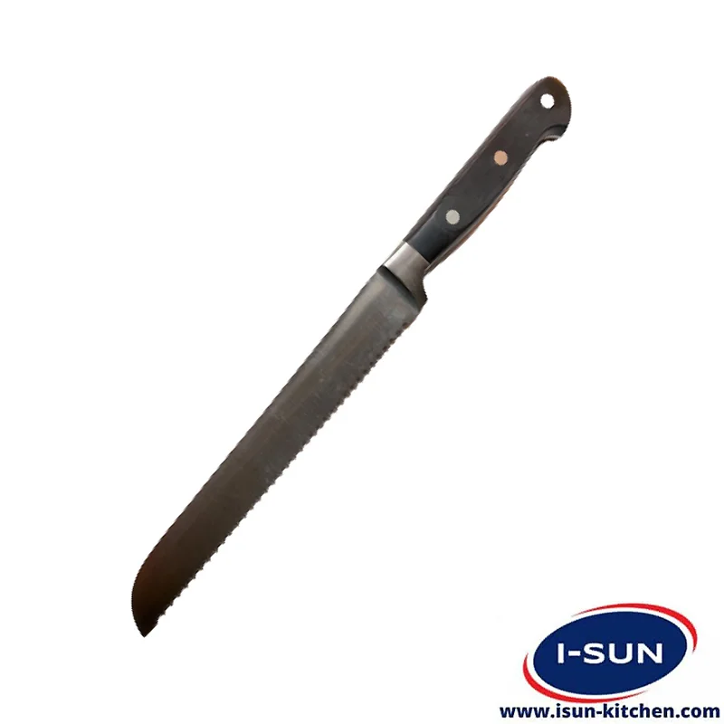 چاقو نان فورج ,برای برش تمیز و آسان کیک و نان نمی توان از کاردهای متداول آشپزی استفاده کرد. با استفاده از چاقو برش نان اره ای به دلیل ساختار دندانه ای تیغه آن این کار را به راحتی انجام خواهید داد.. این محصول دارای طراحی خلاقانه و بسیار کاربردی است. تیغه آن از جنس استیل ضد زنگ با طراحی دندانه دار ریز می باشد.در این روش کیک را بر روی سطحی صاف و محکم طوری قرار دهید که قسمت گنبدی شکل کیک رو به بالا باشد. با استفاده از کارد دندانه دار و با حرکت اره ای (یعنی جلو و عقب بردن مداوم کارد) و به آرامی تاج کیک (سطح برآمده) را برش داده، جدا می کنیم. برخی افراد کیک را بر روی پایه گردون قرار داده و به هنگام برش، گردون را به آرامی می چرخانند. در هر دو روش باید دقت کنید که کارد را در موقعیتی ثابت قرار دهید، در غیر اینصورت برش کیک ناصاف خواهد بود (یعنی در قسمتی ضخامت کیک کمتر و در قسمتی دیگر ضخامت کیک بیشتر خواهد شد).
