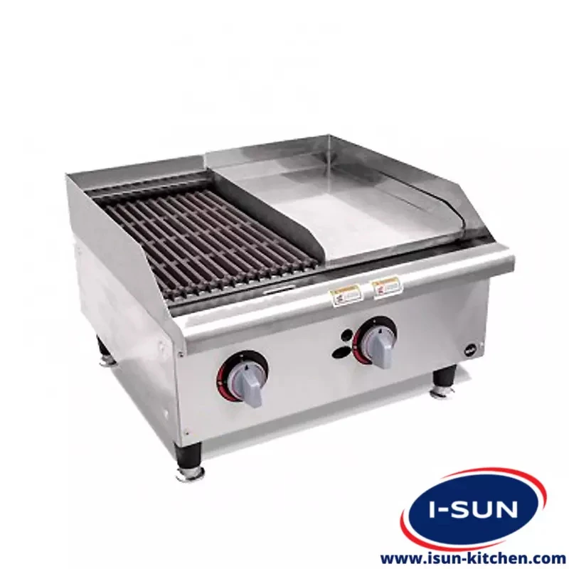 گریل ترکیبی رو میزی با قابلیت تنظیم پایه ها یک گریل با ظاهری مناسب جهت طبخ انواع سوسیس و کالباس ، انواع گوشت ، سبزیجات و.. یک گزینه مناسب برای فست فود های کوچک است. بدنه این گریل تماما از استیل 304 کاملا بهداشتی ساخته شده و بدنه آن از جنس استیل ضدخش می باشدکه نظافت آن را بسیار راحت و آسان می نماید. شعله های این گریل از جنس APW می باشد که طراح این شعله ها کشور ایتالیا می باشد